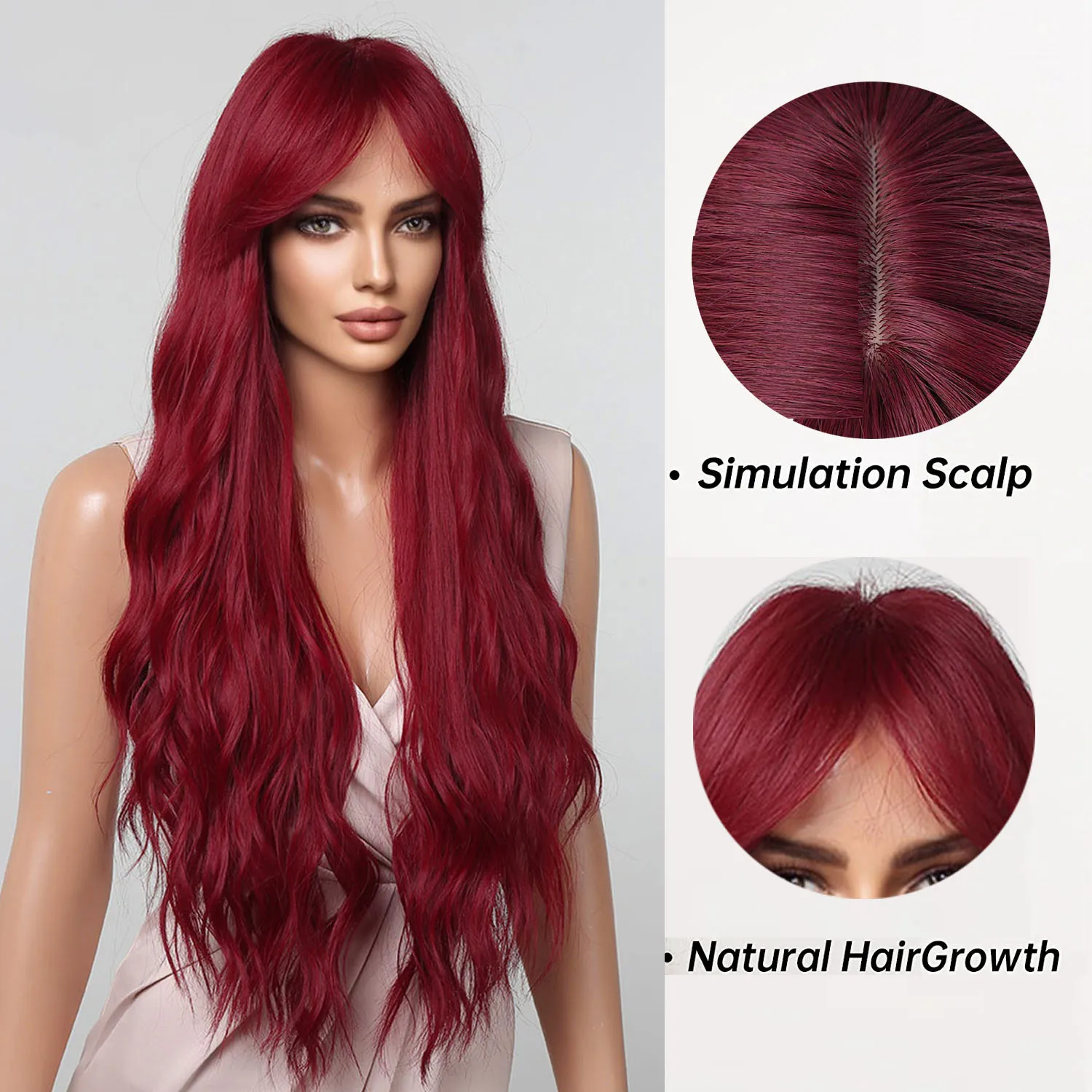 • Long, wavy texture with bangs for a natural appearance